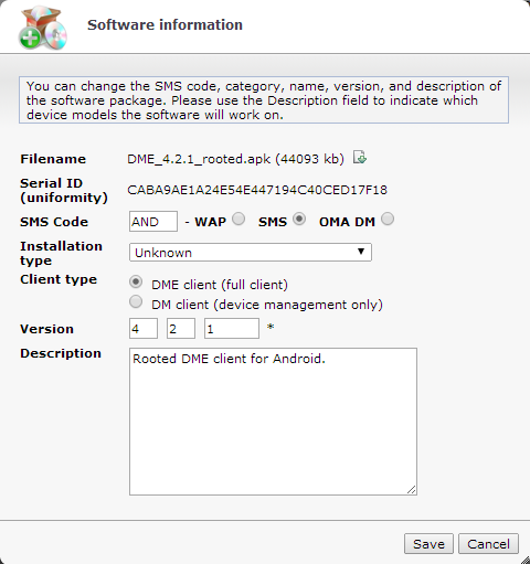 Note that if you select the Upload software action from the Other software panel section, you can upload any other software for Android to DME and have it pushed to the clients. The Software information dialog explained above will look slightly different: