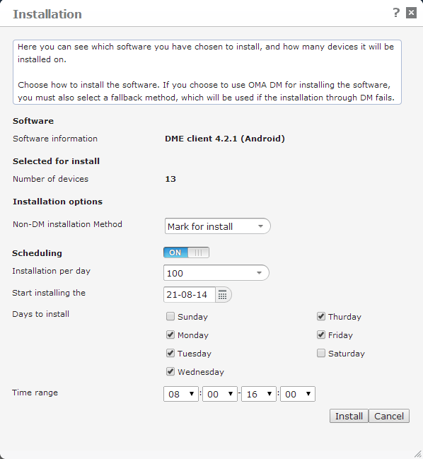 Scheduling: If you enable scheduling, DME will distribute the roll-out of clients as you specify in the fields below, to ease the load on the server. You can choose how many installations DME should initiate per day, a start date, the days of the week where installations should be initiated, and a time range within which it should take place.