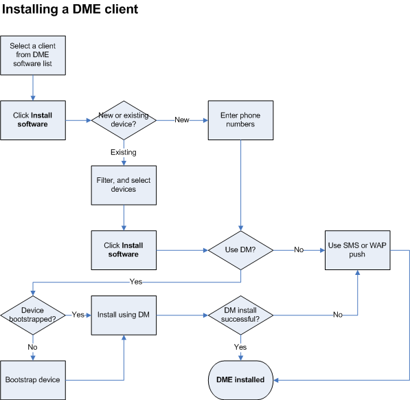 With OMA DM, you can send a command to one or more devices to start the built-in DM engine in the device. The DM engine will supply information to DME about the make, model and other details about the device (bootstrapping). Based on this information, DME will select a DME client and install it silently on the device.
