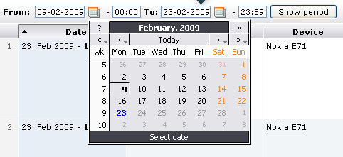 Date filtering is used to show log entries between specific dates and times. To select dates, click the calendar icon in the page menu. A pop-up calendar is shown, allowing you to pick a date. If you also wish to specify times, enter them in the text fields after the dates. When you are done, click Show period. See the illustration below.