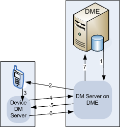 The device will initialize a connection to the DME DM server, which will investigate the device for DME DM functions. This can be illustrated in the following way, where the numbers in the illustration refer to the items below: