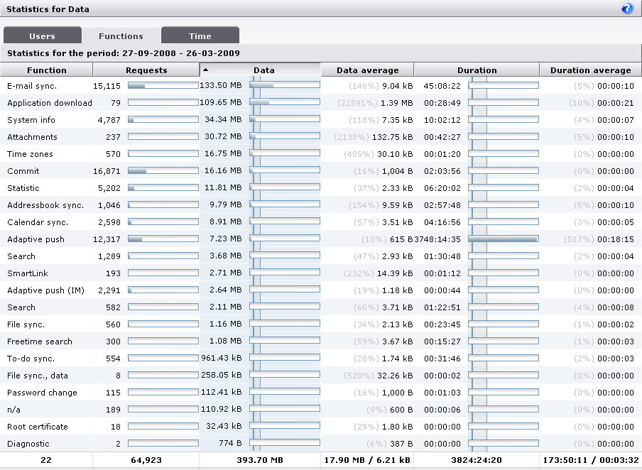 This column shows the amount of DME data transferred on account of each function. After the actual number, a graph shows the function's share in the overall DME data traffic within the specified time frame. The graph is filled with two shades of blue: A dark blue (the left-hand end) showing the percentage of Incoming data (for instance calendar entries created on the device and synchronized to the server), and a lighter blue showing the percentage of Outgoing data (synchronized or downloaded to the device). If you let the mouse pointer rest on either color, a tooltip text will reveal the actual percentage.