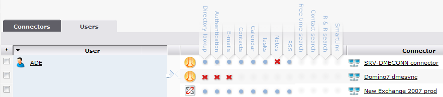 Note that a blue dot is not shown until the user has actually performed the function. For instance, if connector A is set up to run the Contact search function, a blue dot is not shown in the Contact search column for a user until the user has in fact performed a search for contacts in the Global Address Book on his or her DME client. In other words, the route is not created for the user until required.