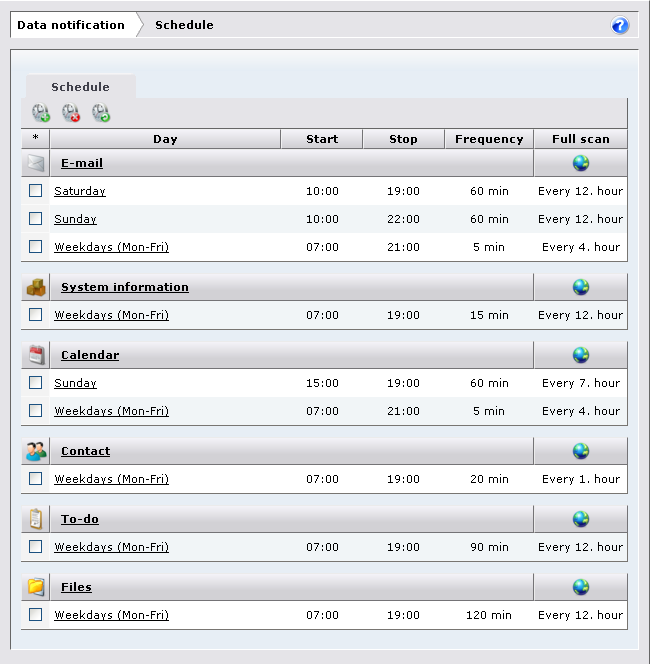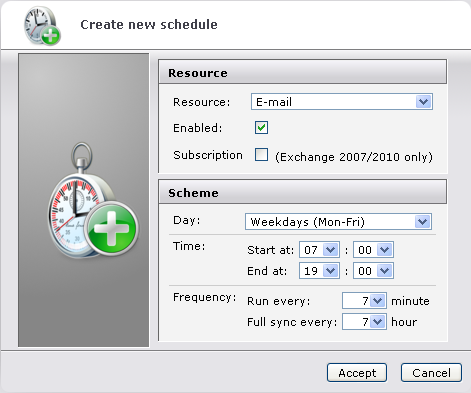 Note that the schedule only applies to automatic synchronization (push and pull). In case of manual synchronization from the client, and in case the client has created new items (such as an e-mail), a full synchronization is always performed.