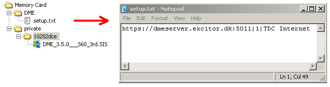 private10202dce.sis) to the folder 10202dceDMEsetup.txt (see below)setup.txt to the DME folderThe setup.txt file must be a plain text file with one line in the following format: