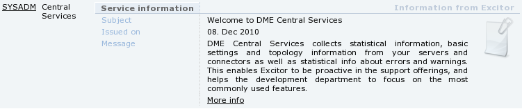 Messages in the Central Services category show information from the DME Central Services server. New messages are picked up by the DME server when it accesses the DME Central Services server (see Central Services).