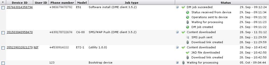 This column shows the device ID (typically IMEI number) of the device on which the installation job was carried out. The ID is only shown when the device has been connected to the DME server through DM.