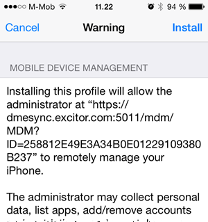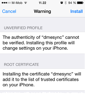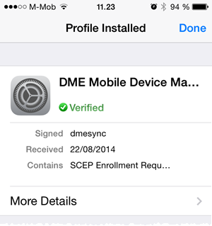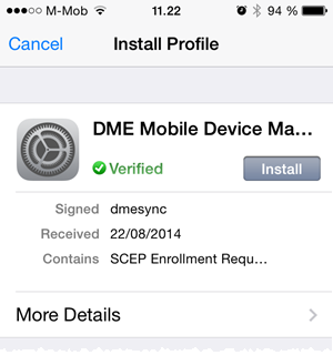 When tapping Install, the DME MDM server and the device will communicate using SCEP. It will proceed through the following actions: