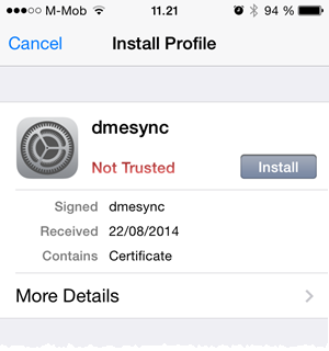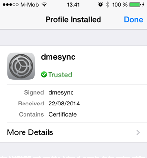 Please note: On some devices, the certificate appears to be Not trusted and Unsigned. This is due to a quirk in iOS and has no practical importance for the security of DME.