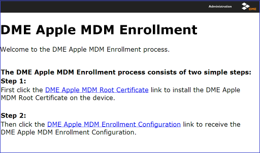 When the user has been directed to the DME Apple MDM Enrollment web page, he or she is presented with the following page containing instructions and two links: