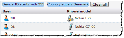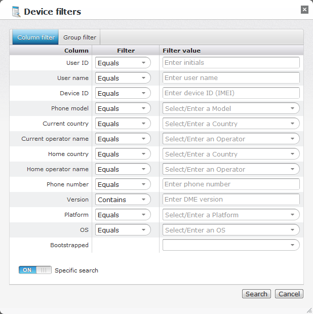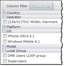 If your filtering needs are not sufficiently covered by the standard filter bar, click the Advanced button to open the Device filters dialog. From here, you can find specific instances of what you are searching for (the standard filter finds whatever contains the phrase you are searching for - for instance, searching for TDC as Operator finds both TDC and TDC Mobil), you can add other operators (for instance not equal, greater than, smaller than), and you can search for devices that belong to specific groups.
