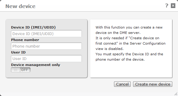 This action should normally only be used if "Create device on first connect" in the Authentication section of the Server configuration panel is disabled. If that setting is enabled, you can simply push the DME client by SMS/WAP or OMA DM to the new devices, and they will be created automatically in DME the first time they connect to the DME server. For more information about this, see Authentication. If this is not possible, you can create the device manually by selecting the New device action. DME shows the following page: