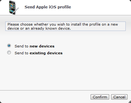 If the device(s) to which you want to send the profile already exist in DME, select Send to existing devices, and click Confirm. A list of existing Apple iOS devices is shown. Select the relevant devices, and click the Send configuration action. For more information about this window, see Device filter.