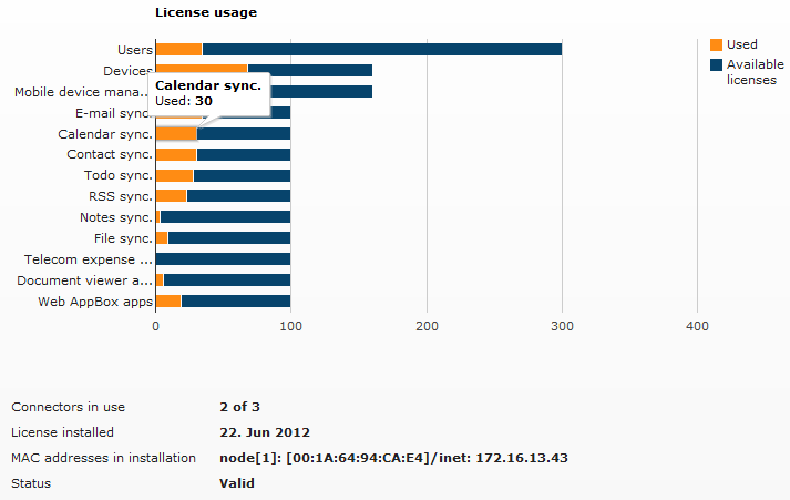 For each type of license, the total number of licenses is shown as a horizontal bar. The orange part of the bar indicates the number of licenses that have been used; the blue part shows how many are available. If you let the mouse pointer rest on any bar, a box shows the precise number of available licenses for the license type in question.