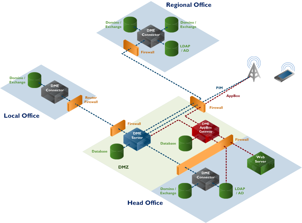 A key feature of the DME server is that it can be installed into enterprises which are geographically separated into many locations and segmented into many networks, possibly using different operating systems and even different collaboration systems. This flexibility is due to the DME connector. The concept of connectors allows for the installation of a "DME module" wherever the circumstances call for it. The only requirement for installing a DME connector is that the DME users for the connector in question are found in the same LDAP/AD directory as that of the main DME server.