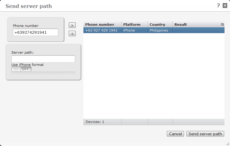In order to send the server path to an iOS device, which is not yet created in the Devices list, you must mark the field Use iPhone format. This will format the SMS in a special way, and the SMS can then only be used by iPhone devices.