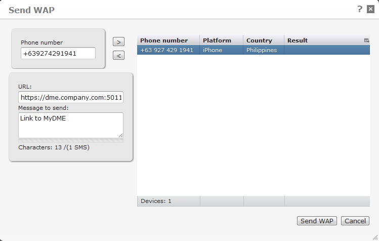 Enter one or more phone numbers (or select one or more devices/users before selecting this function). You can add more devices to the list by entering their phone numbers in the Phone number field and clicking the > arrow. Enter one or more phone numbers. The international calling code preceded by a + is mandatory. If you do not enter a calling code yourself, DME inserts the code defined in the field Phone country code in the SMS modem setup page (see SMS modem). To remove a device from the list, select it, and click the < arrow.