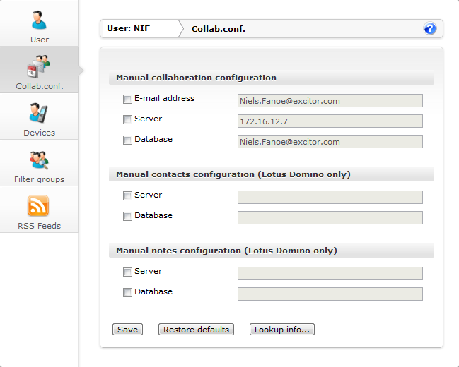 In this panel section you can enable or disable push mail, and you can inspect or change the user's configuration in the collaboration system. The collaboration configuration is a vital part of the user configuration. You can manually change the default configuration of the collaboration system for this user within four areas: SMS push setting, e-mail setup, contacts setup (Domino only), and personal notebook setup (Domino only).