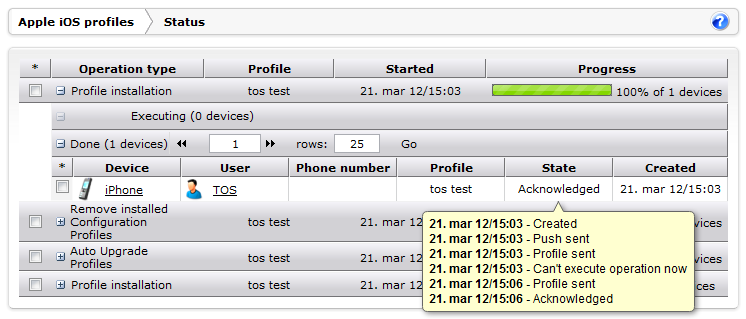 In the Status section of the Apple iOS profiles setup panel you can monitor the installation of Apple iOS profiles.