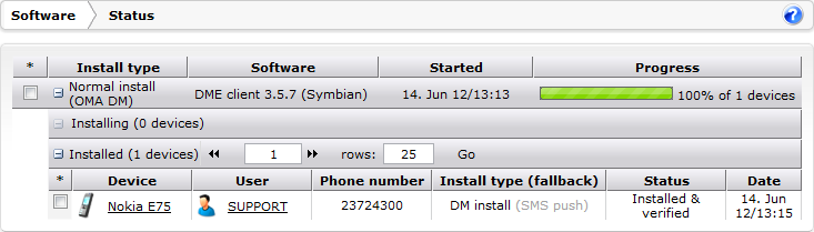 Every time an installation is initiated from the software list (either DME clients or Other software), an entry is made in this panel section. Each entry is called an installation job, and may consist of installations on one or many devices.