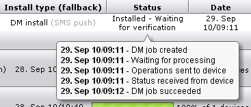 This column shows the kind of installation job: Normal install or Bootstrap devices. The installation type is followed by the installation method in parentheses - OMA DM, WAP/SMS Push etc. For more information about install types (job types), see Provisioning status.