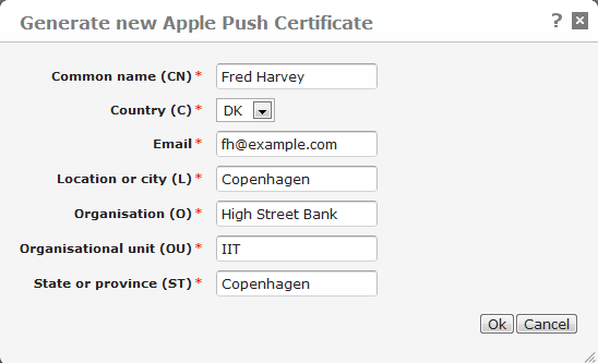 To generate the certificate, click Create new. A window pops up in which you can enter information about your organization, just as when you created the Apple Push certificate (see Apple Push Certificate above). The Common name (CN) that you enter here will be used as the name of the Apple MDM profile on the users' devices.