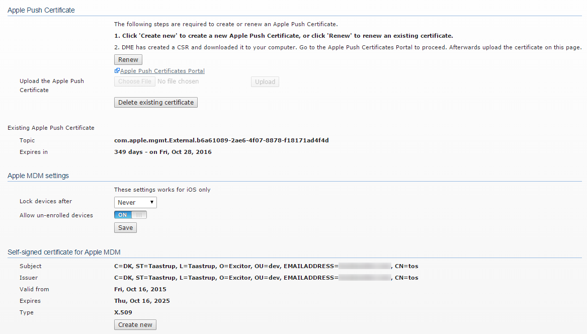 With this group of functions you can manage the Apple Push Notification Service (APNS) certificate, which is required for using DME as an Apple MDM server. DME detects if an APNS certificate has already been installed, and shows a Create new button or a Renew and Delete existing certificate button accordingly.