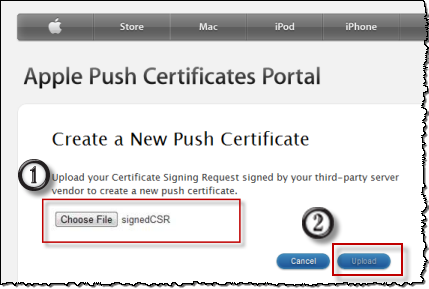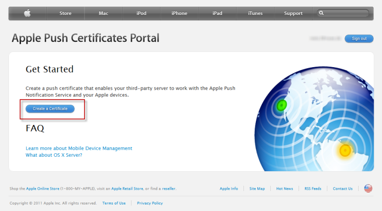 https://identity.apple.com/pushcert/) in your browser.After signing in, you reach the Apple Push Certificates Portal page. If you have any existing certificates, they are listed here. If you do not have any certificates yet, the page will look like this: