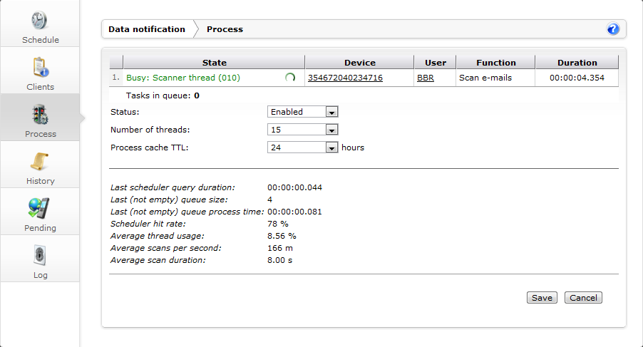 In the Process section of the Data notification panel you can specify features of the way DME scans the collaboration system for changes in users' mailboxes etc. You can turn scanning on or off, and you get a live view of the scanning processes (the scanner threads).