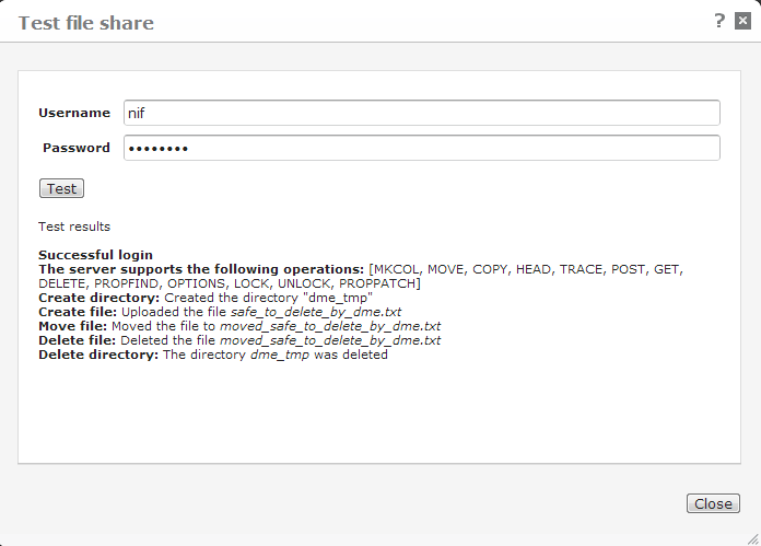 With this dialog, you can test the connection to a file share by supplying the actual credentials of a user. If the connection is successful, it means that the user in question will be able to reach the file share through AppBox File Browser.